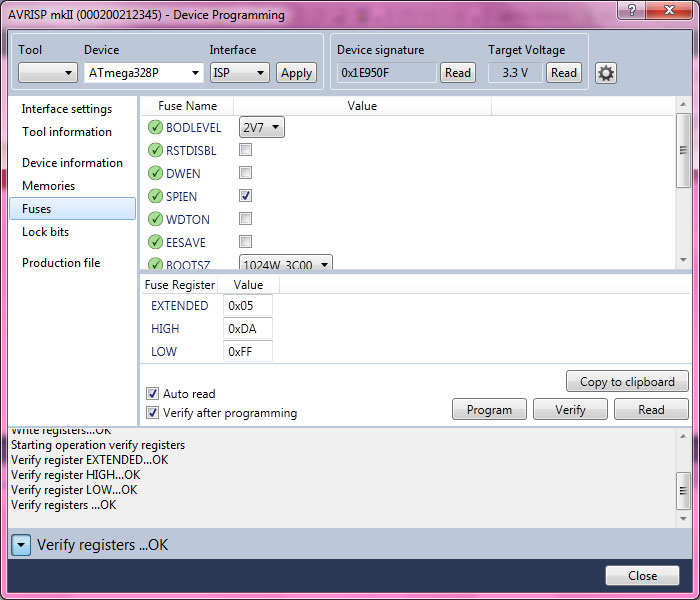 بعد از اتمام این کار به منوی Fuses بروید و مقادیر مناسب با میکروکنترلر خود را تنظیم نمایید. سپس بر روی Program کلیک کنید. اگر همه چیز درست پیش رفته باشد متن Verifying registers… OK را در کادر پایین صفحه مشاهده خواهید کرد.