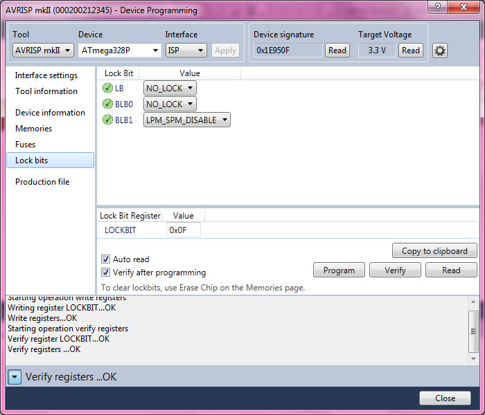 حال از منوی سمت چپ بر روی Lock Bits کلیک کنید و در کادر LockBit Value مقدار مناسب با میکروکنترلر خود را وارد کنید و بر روی Program کلیک کنید. اگر همه چیز درست پیش رفته باشد در کادر پایین صفحه Verifying registers… OK را خواهید دید. تبریک میگم بوت لود شما با موفقیت برروی کنترولرتون پروگرم شد. اگر بوت لودر رو با موفقیت نصب کرده باشید، چراغ وضعیت برد به صورت ضربان قلب فلش می زند. برای آپلود کردن Sketch ها از برنامه Arduino IDE استفاده کنید.